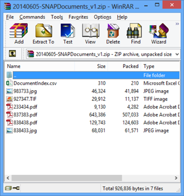The zip file will contain all documents at the root level. The zip file will contain a DocumentIndex.csv file and each document. Example:
